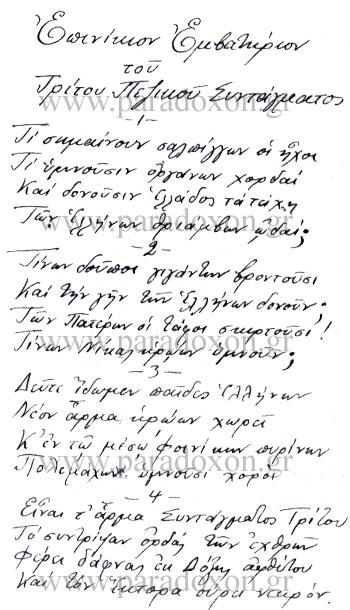 Επινίκιο Εμβατήριο του 3ου Πεζικού Συντάγματος από τον Ανδρέα Ι. Βλάχο (Οικογενειακό αρχείο Μαρίας Καλλάρη) *******