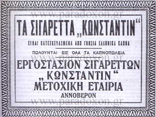 Η καθημερινή, μισοσέλιδη διαφήμιση των "Σιγαρέττων Κώνσταντιν"